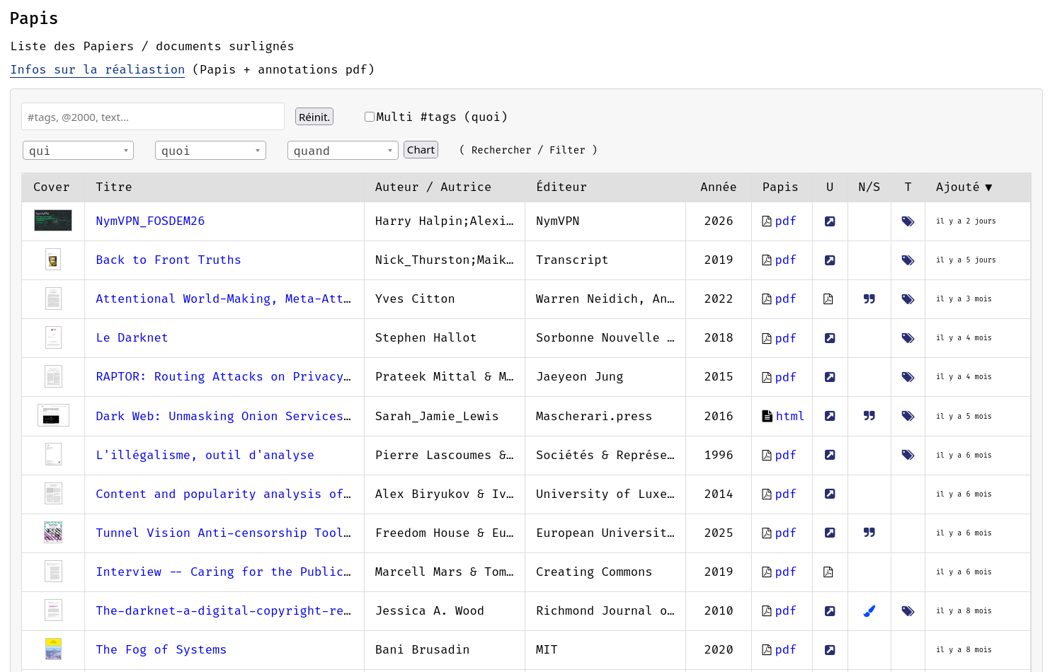 2024-05-13 12:05 changelog git - Chronologie - Arborescence - Home switch (a,b,c...) - (e)(f)(g) : fiches - Backlinks / rétroliens + Tags + Alias - Chapitres / Toc - Pagination - Popups - Bibliothèque (imports) - Bash outils (imports) - Bibliographie papis (+interopérabilité) - Grille large + pagination - Favicons - Minimap - imprimer - adresse .onion